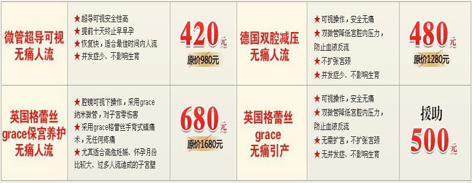 作為安徽計劃生育定點合作單位,經省衛生廳聯合決定,廬江康平婦產醫院被授予安徽省意外懷孕援助基地,通過援助基金的發放使的人流價格比其他醫院低30%-60%。人流幾個透明公示如下:微管超導可視無痛人流420元(原價980元)、德國雙腔減壓無痛人流480元(原價1280元)、英國格蕾絲保宮養護型人流680元(原價1680元)、英國格蕾絲無痛引產援助500元。溫馨提示,由于申請援助的人數過多,如需基金援助請點擊網絡預約,免除排隊等候,節約您的時間?!?a href="http://m.bcll.cn/zthd/" target="_blank">查看援助詳情